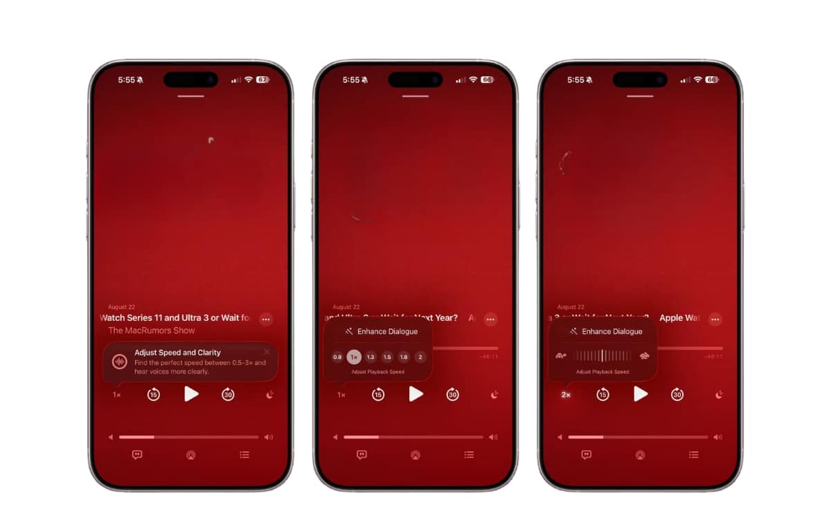 أضافت آبل ميزة جديدة كليًا تحمل اسم Enhance Dialogue تعمل على عزل الأصوات البشرية وإبرازها بشكل أوضح عند الاستماع للبودكاست في أماكن مزدحمة أو مع وجود ضوضاء في الخلفية، ويستفيد التطبيق من خوارزميات الذكاء الاصطناعي المدمجة في النظام لفصل الكلام عن المؤثرات الأخرى، مما يجعل التجربة أكثر وضوح وراحة للأذن، ويتم تفعيل الميزة بسهولة عبر مشغل الحلقة من خلال الضغط على أيقونة التحكم ثم اختيار Enhance Dialogue، وهي خطوة مهمة خصوصًا للمستمعين الذين يعتمدون على سماعات عادية أو يستمعون أثناء التنقل.