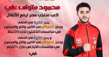 حصد محمود متولي لاعب منتخب رفع الأثقال ذهبيتي الكلين والمجموع وفضية الخطف في منافسات وزن 71 كجم تحت 20 سنة بالبطولة العربية التي تستضيفها قطر بينما حقق فضية الخطف وذهبيتي الكلين والمجموع على صعيد الكبار كما حصل إياد محمد على ثلاث برونزيات في فئة تحت 20 سنة ومثلها في فئة الكبار في منافسات نفس الوزن.